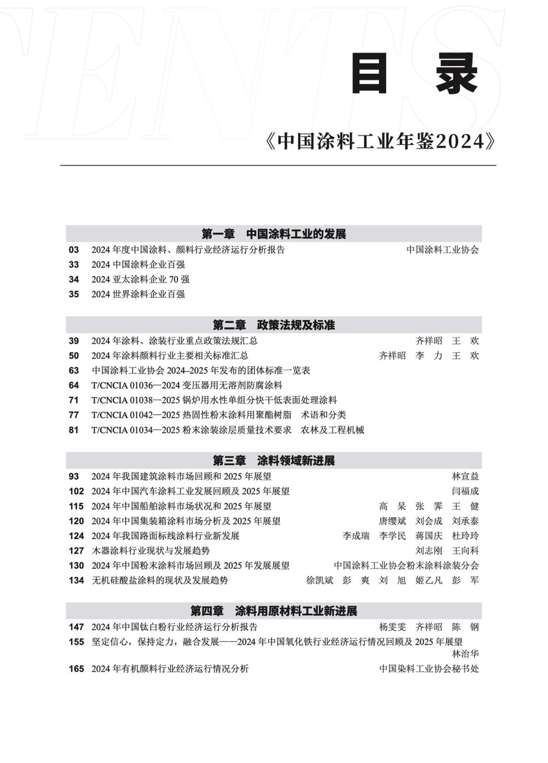第二章,政策法规及标准。收集汇总了2024年度涂料和颜料行业相关的重点产业政策和法规、2024年涂料颜料国家标准、行业标准和团体标准发布情况,收录了《变压器用无溶剂防腐涂料》等4个团体标准全文,为涂料、颜料行业了解国家政策法规与标准制定提供了依据。