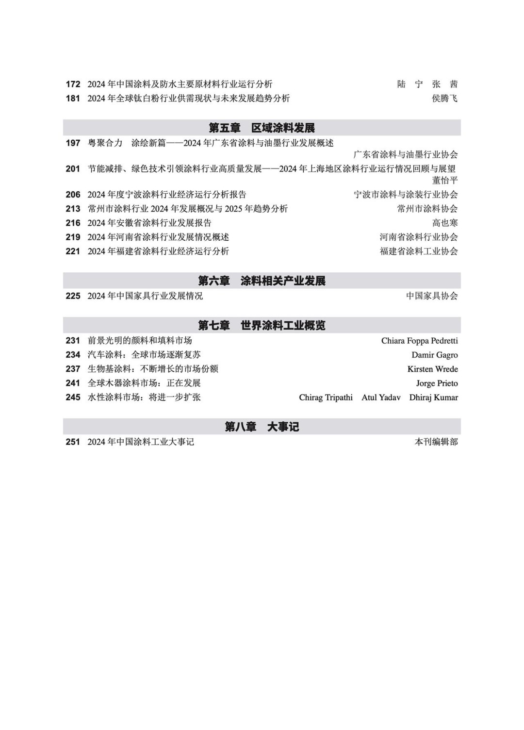 第七章,世界涂料工业概览。收录了2024年全球汽车涂料、生物基涂料、木器涂料、水性涂料和涂料颜料填料市场发展状况,为国内企业了解世界涂料工业发展提供了借鉴。