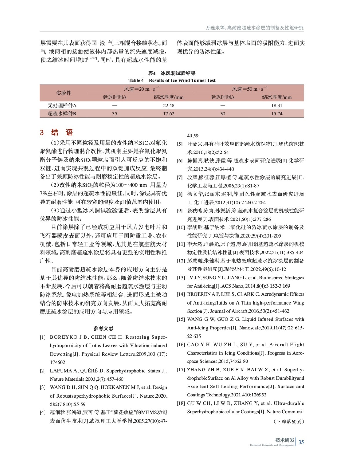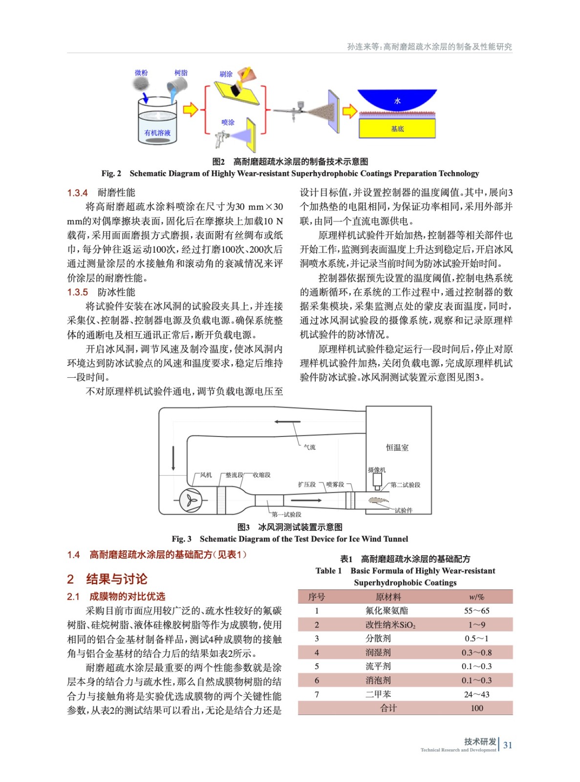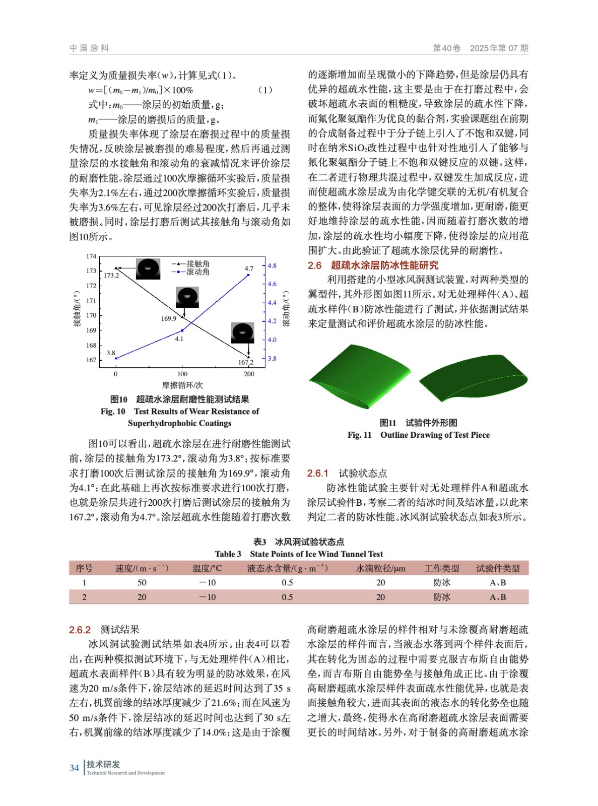摘要:为了有效提高飞行器蒙皮表面涂层的防覆冰性能和耐磨性,以自制的高性能氟化聚氨酯和改性纳米SiO2为原料,采用物理混合的方法成功制备出高耐磨超疏水涂层材料。探讨了改性纳米SiO2用量和粒径大小对涂层疏水性能的影响。讨论了不同温度和不同pH值对涂层稳定性的影响。最后,对涂层的耐磨性及防冰性能进行了研究,改性纳米SiO2的粒径为100~400 nm,质量分数为7%左右时,涂层的疏水性能最佳。同时,涂层具有优异的耐磨和防冰性能,可在较宽的温度及pH值范围内使用,通过小型冰风洞试验后,在风速为20 m/s条件下,涂覆高耐磨超疏水的涂层样件相对于未涂覆高耐磨超疏水的涂层样件的结冰时间延迟了35 s左右,机翼前缘的结冰厚度减少了21.6%;而在风速为50 m/s条件下,涂覆高耐磨超疏水涂层样件相对于未涂覆高耐磨超疏水涂层样件的结冰时间延迟了30 s左右,机翼前缘的结冰厚度减少了14.0%。合理控制超疏水涂层中改性纳米SiO的用量和粒径大小能够显著提高涂层防冰和耐磨性,涂层具有良好的应用潜力。