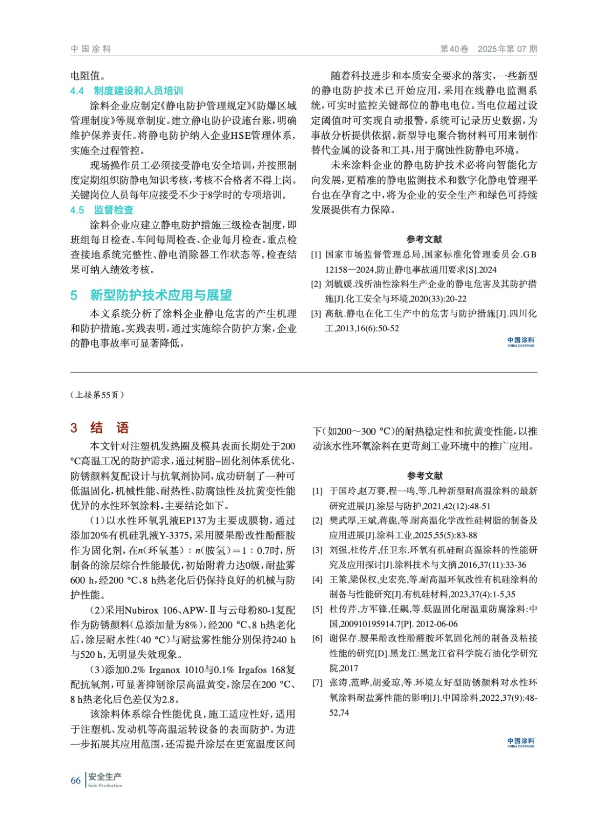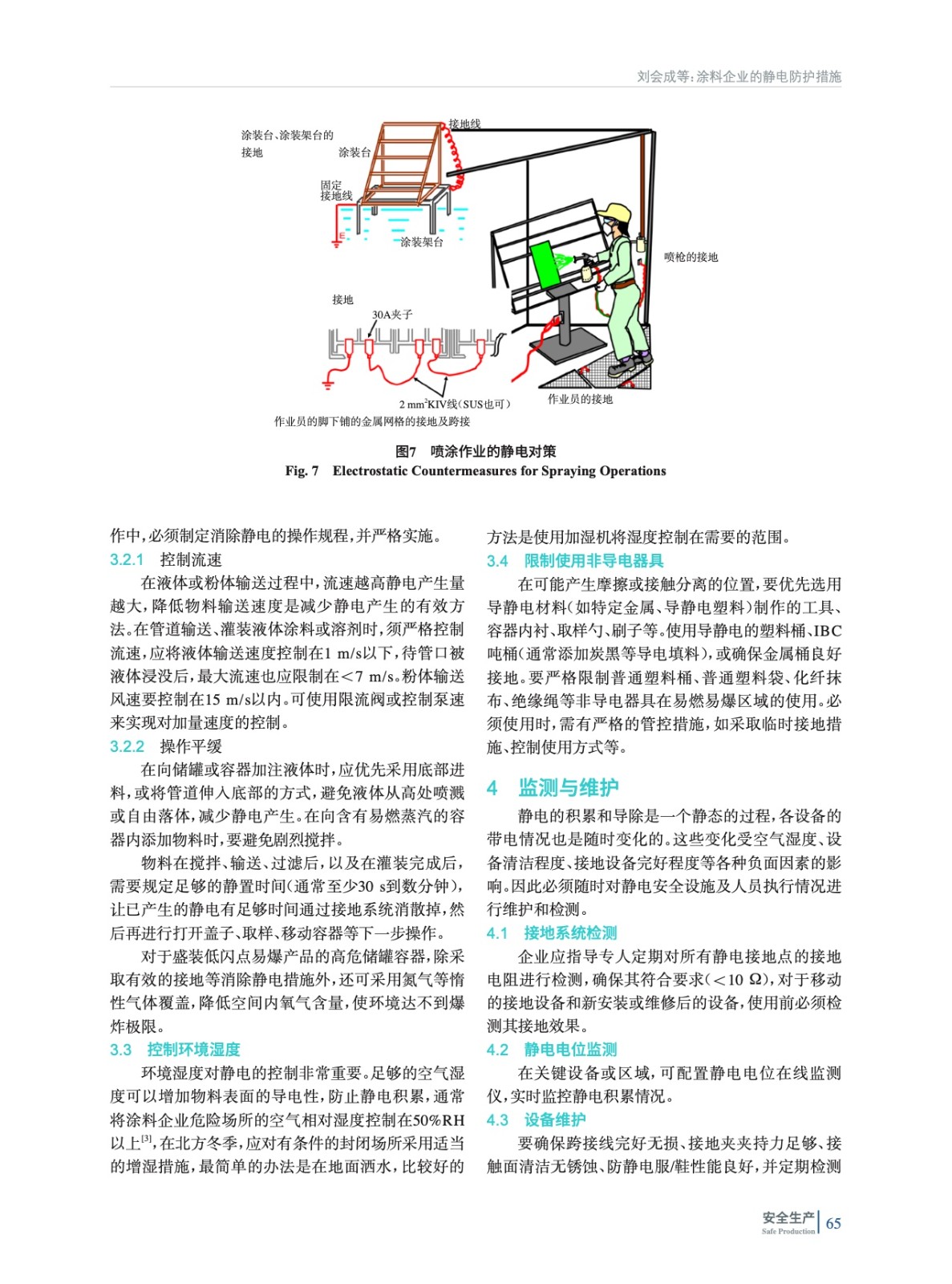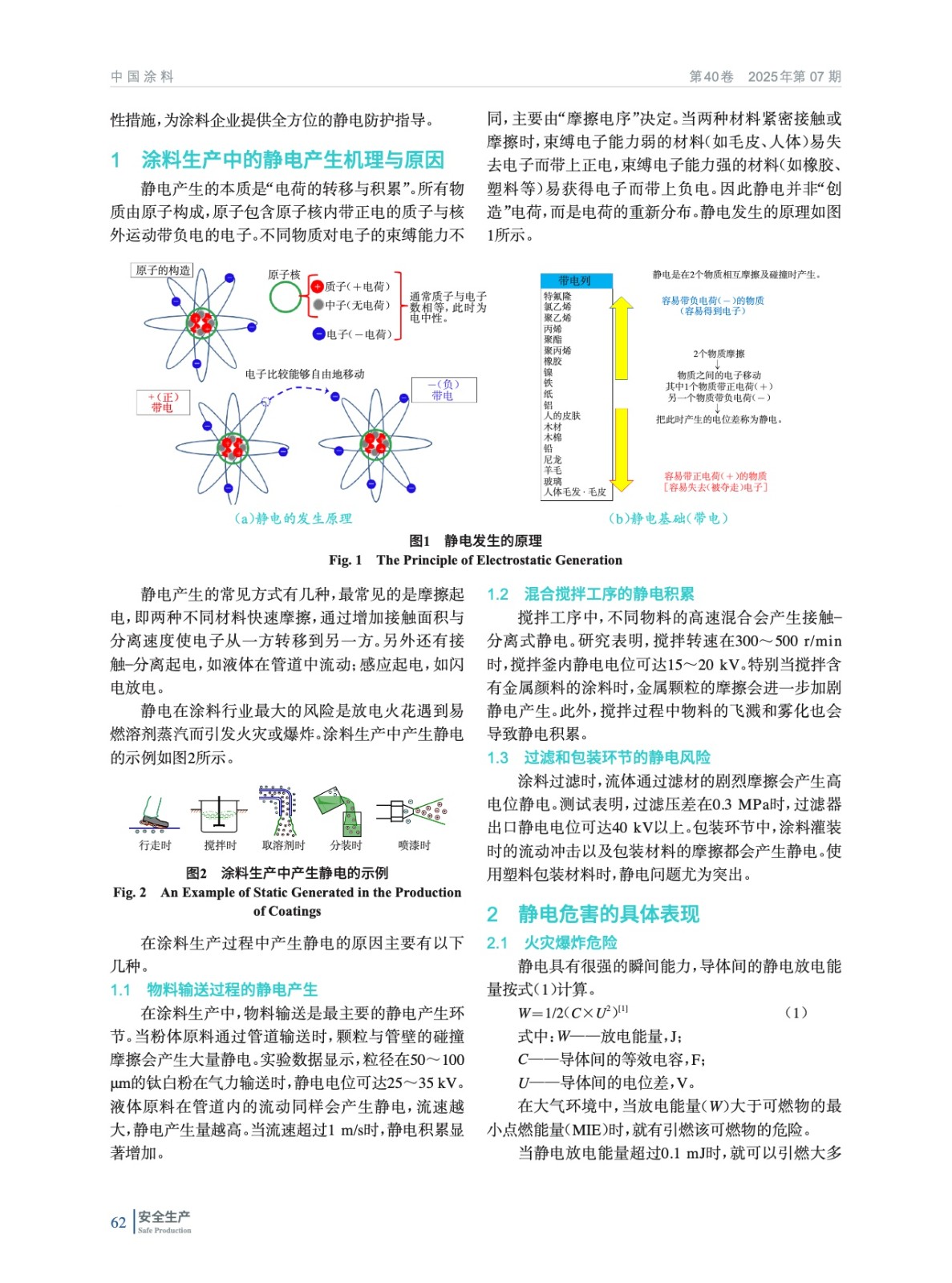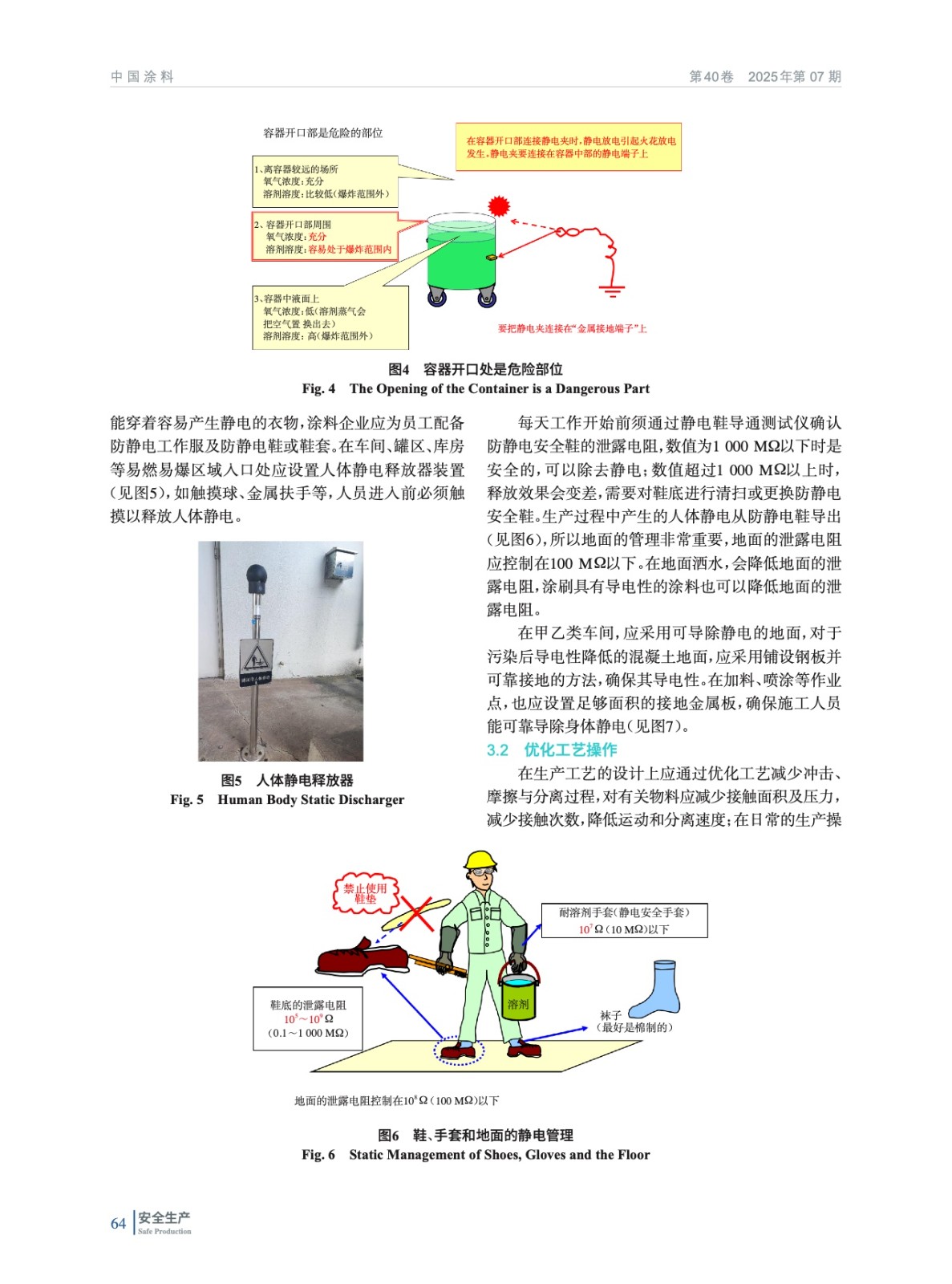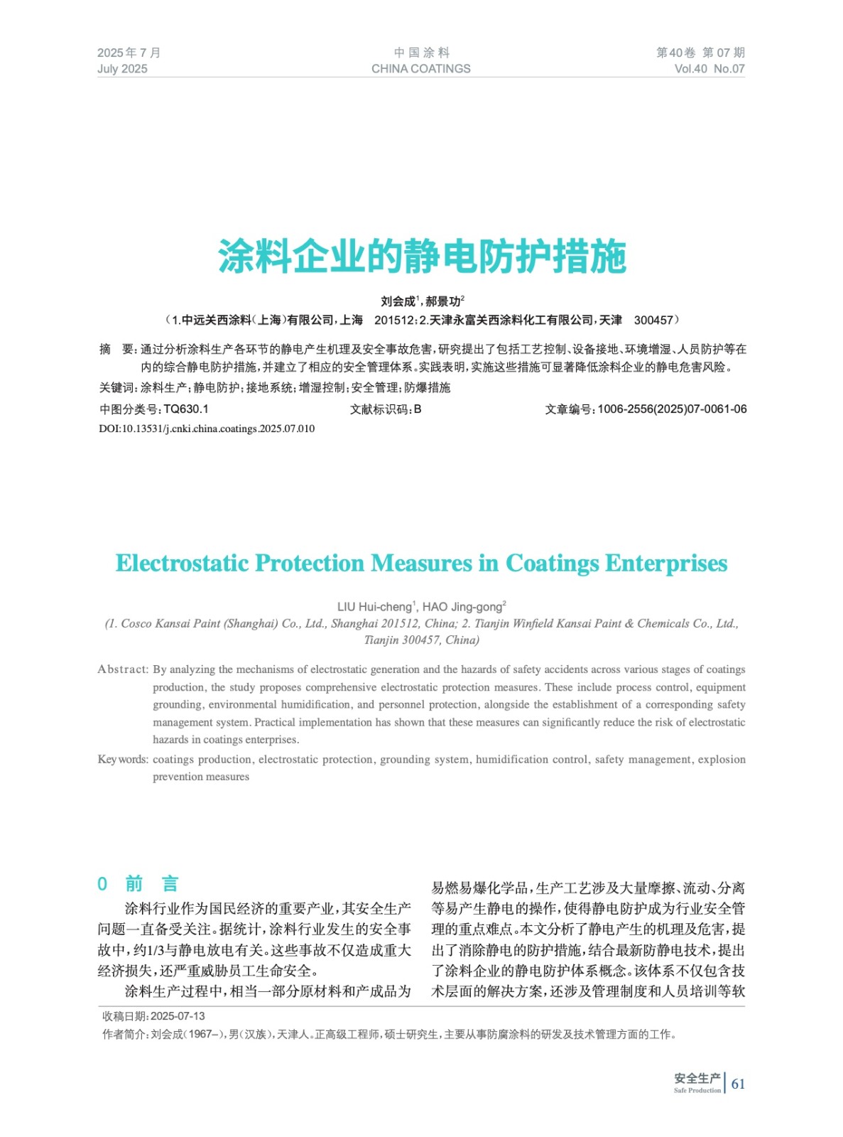 通过分析涂料生产各环节的静电产生机理及安全事故危害,研究提出了包括工艺控制、设备接地、环境增湿、人员防护等在内的综合静电防护措施,并建立了相应的安全管理体系。实践表明,实施这些措施可显著降低涂料企业的静电危害风险。
