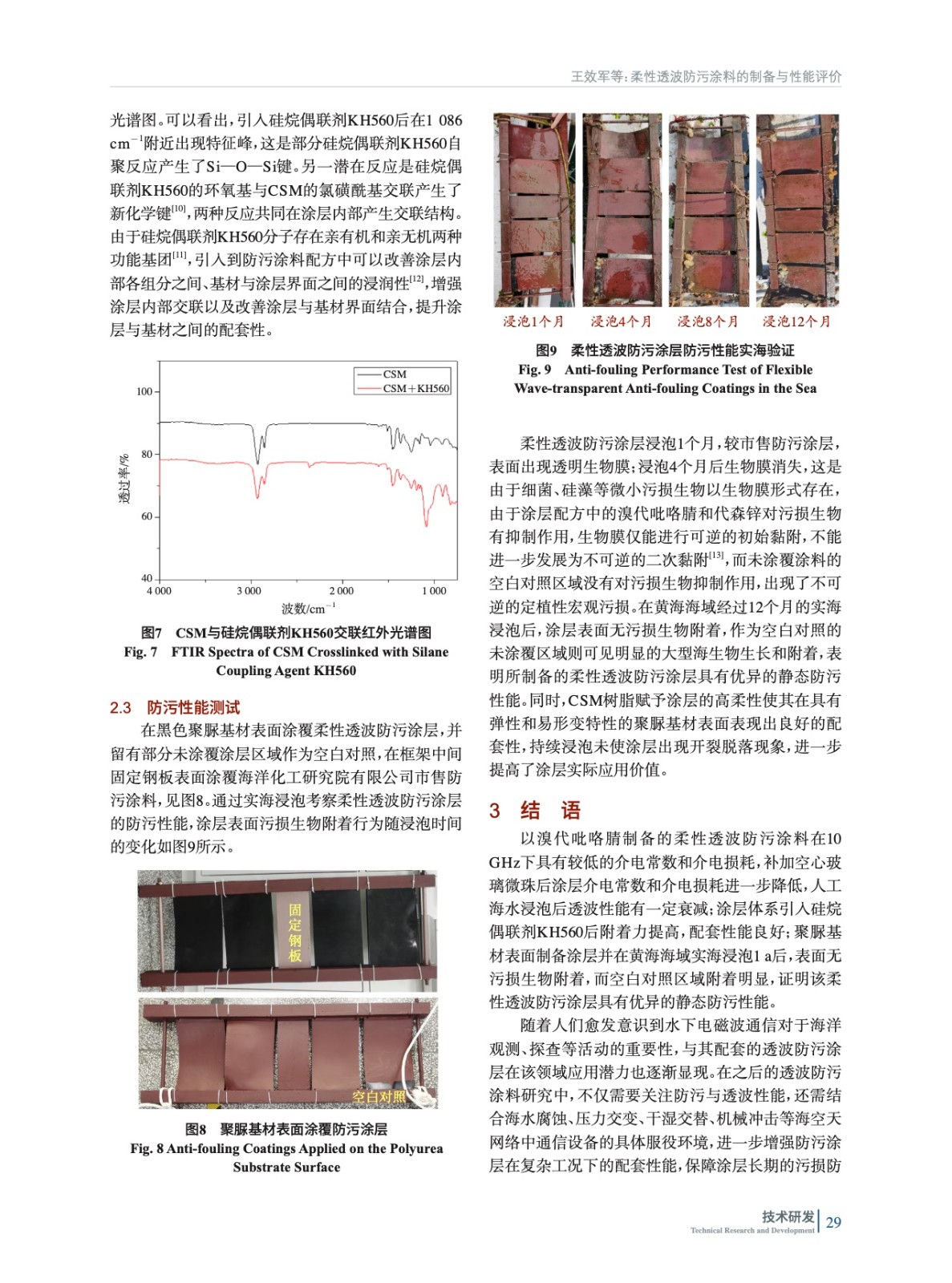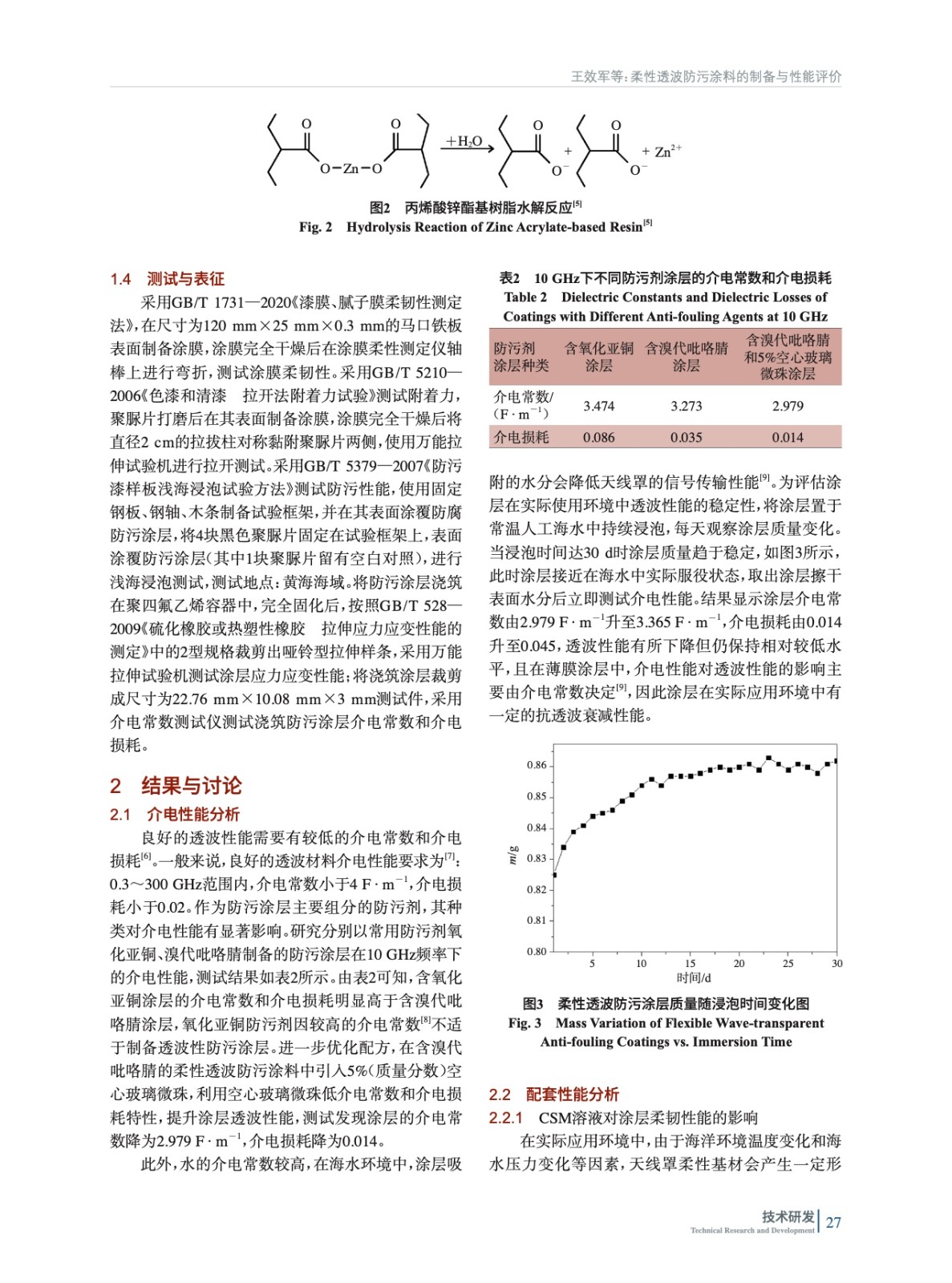 摘要:为满足静态工况下水下天线罩对透波性能、长效防污能力及基材适配性的防护涂层需求,研究制备了以氯磺化聚乙烯树脂和丙烯酸锌树脂为基体的柔性透波防污涂料,通过引入硅烷偶联剂KH560增强界面结合,并添加空心玻璃微珠优化介电性能。涂层在10 GHz频率下介电常数与损耗角正切分别为2.979与0.014,涂层具有抗透波衰减特性;涂层在聚脲基材上的附着力达3.06 MPa,配套稳定性显著提升;黄海海域实海挂样1 a后,涂层表面无污损生物附着,空白对照组则出现明显生物附着。该涂层在静态水下天线罩污损防护领域展现出良好的应用前景。