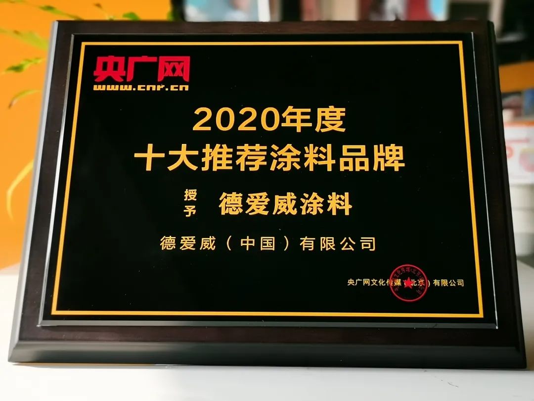 - 德爱威获得央广网“2020年度十大推荐涂料品牌”称号