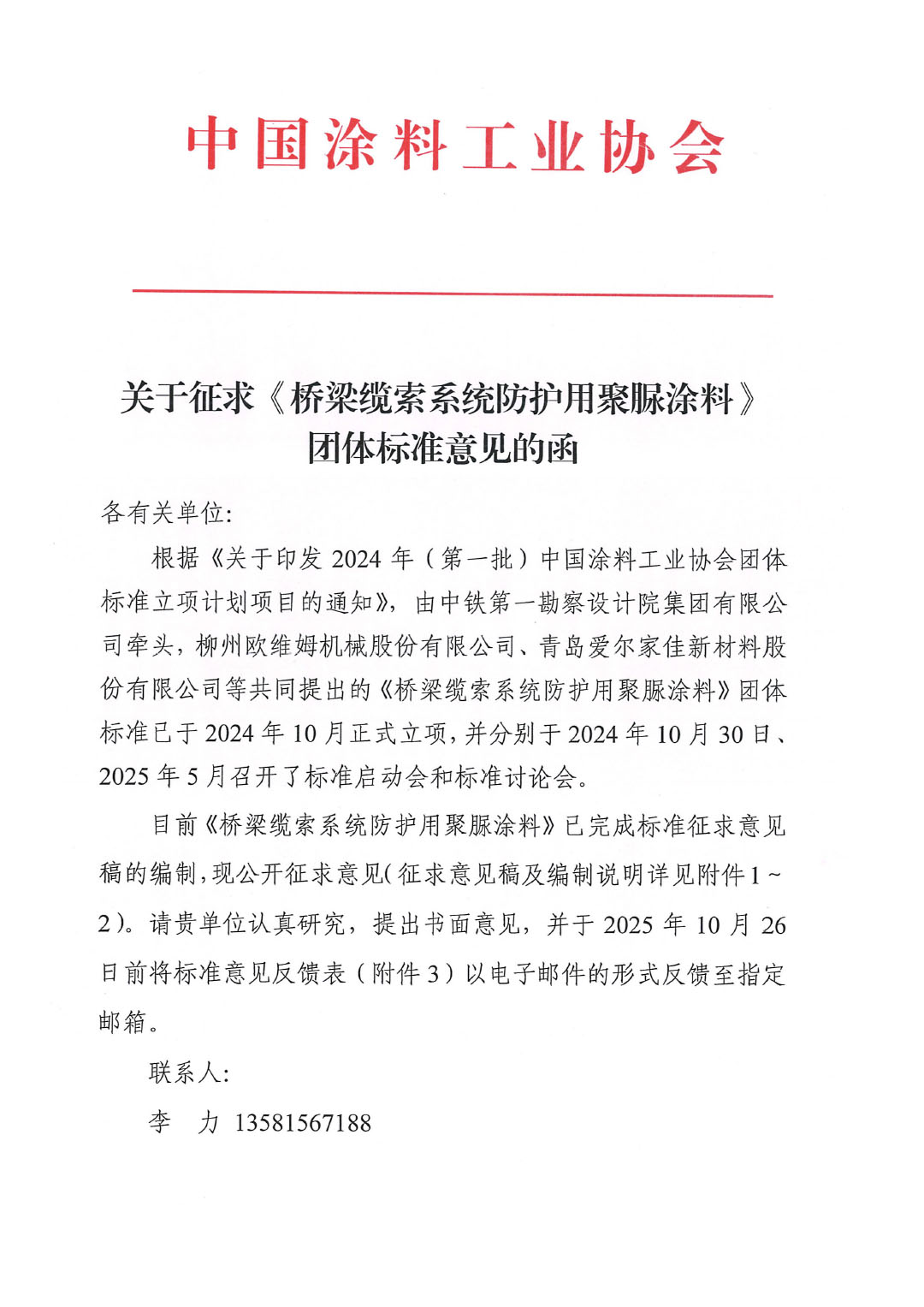 根据《关于印发2024年(第一批)中国涂料工业协会团体标准立项计划项目的通知》,由中铁第一勘察设计院集团有限公司牵头,柳州欧维姆机械股份有限公司、青岛爱尔家佳新材料股份有限公司等共同提出的《桥梁缆索系统防护用聚脲涂料》团体标准已于2024年10月正式立项,并分别于2024年10月30日、2025年5月召开了标准启动会和标准讨论会。