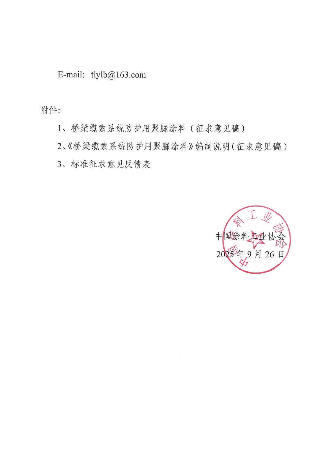 关于征求《桥梁缆索系统防护用聚脲涂料》团体标准意见的函