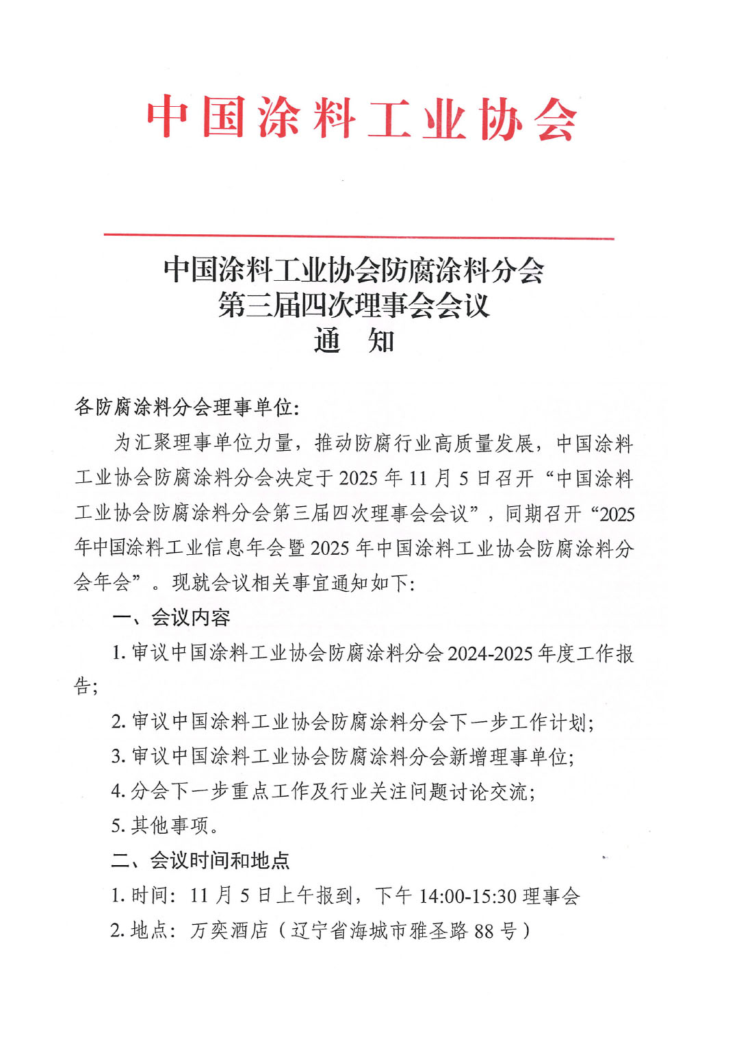 中国涂料工业协会防腐涂料分会第三届四次理事会会议通知