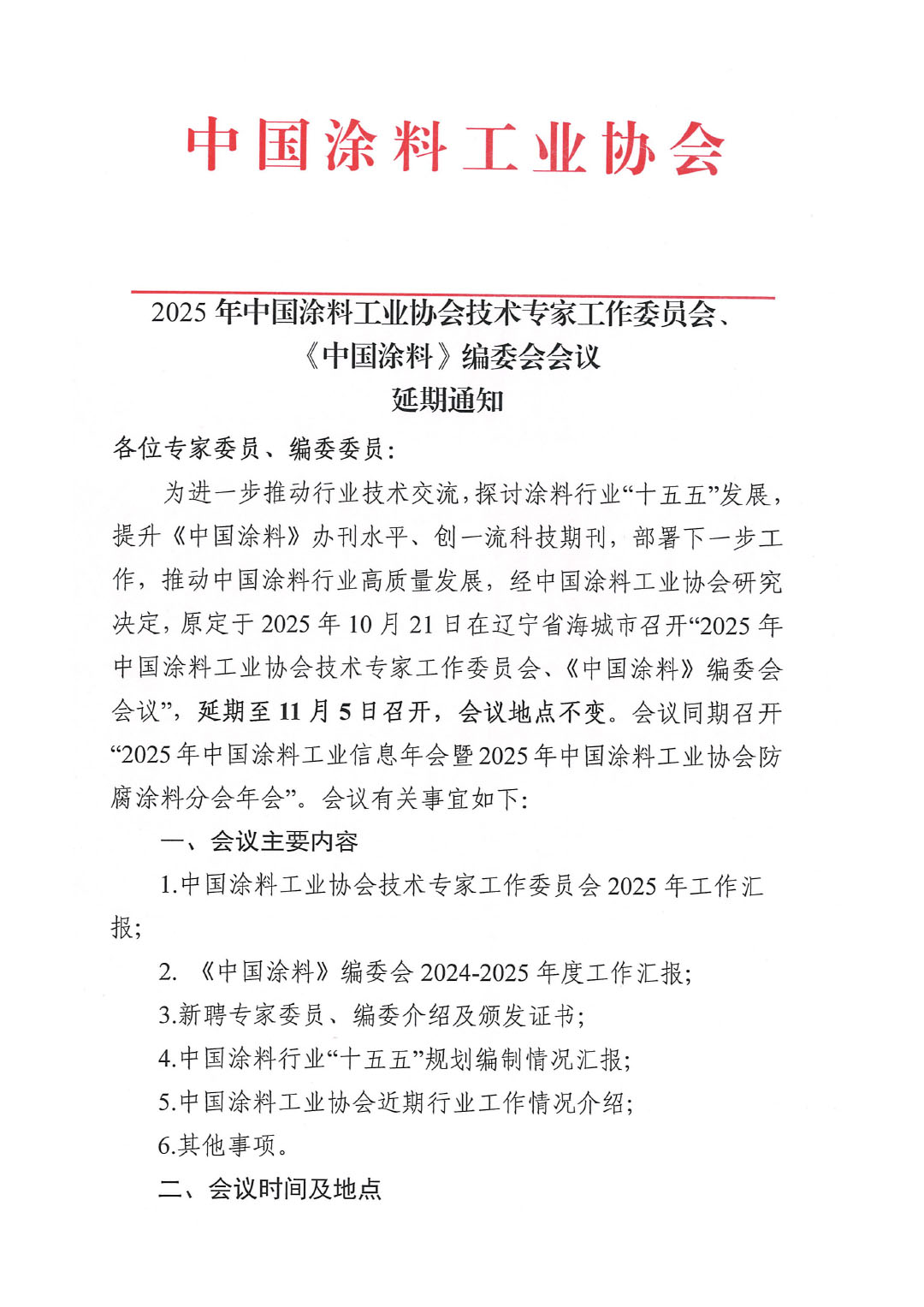 2025年中国涂料工业协会技术专家工作委员会、《中国涂料》编委会会议延期通知
