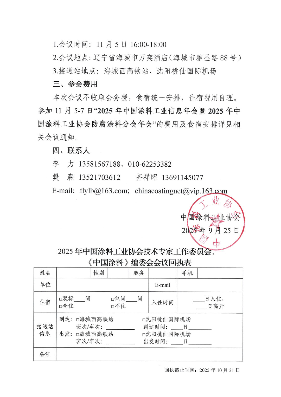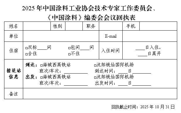 本次会议不收取会务费,食宿统一安排,住宿费用自理。参加11月5-7日“2025年中国涂料工业信息年会暨2025年中国涂料工业协会防腐涂料分会年会”的费用及食宿安排详见相关会议通知。